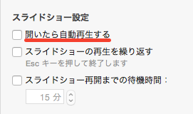 「書類」>「スライドショー設定」の、「開いたら自動再生する」のチェックを外しておく