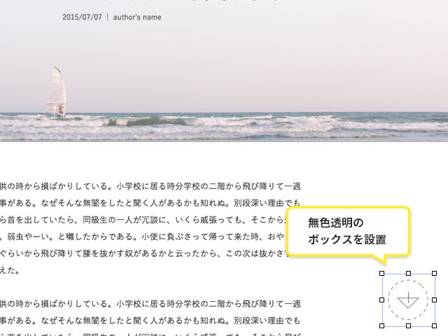 ボタンのエリアを囲むサイズの長方形オブジェクトを配置します。このとき、オブジェクトは塗りも線ももたない無色透明の状態にします(あくまでクリッカブルな範囲を指定するだけのオブジェクトとして置きます)。