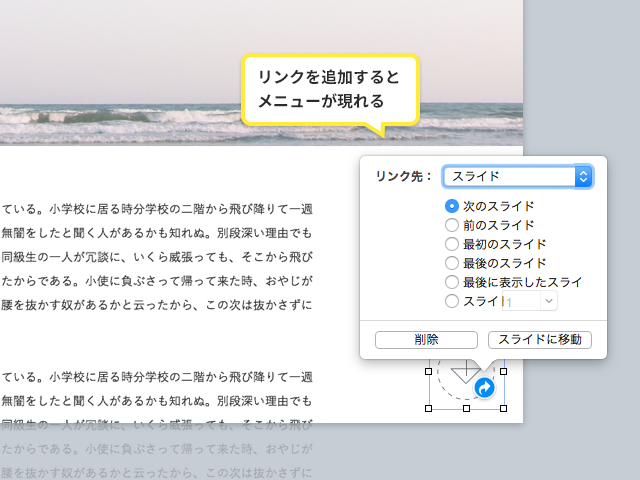 「フォーマット」>「リンクを追加」(もしくは⌘+K)で、リンク可能なエリアになります。この時点で飛び先を選べるオプションが出てきますので、用途に応じて指定します。