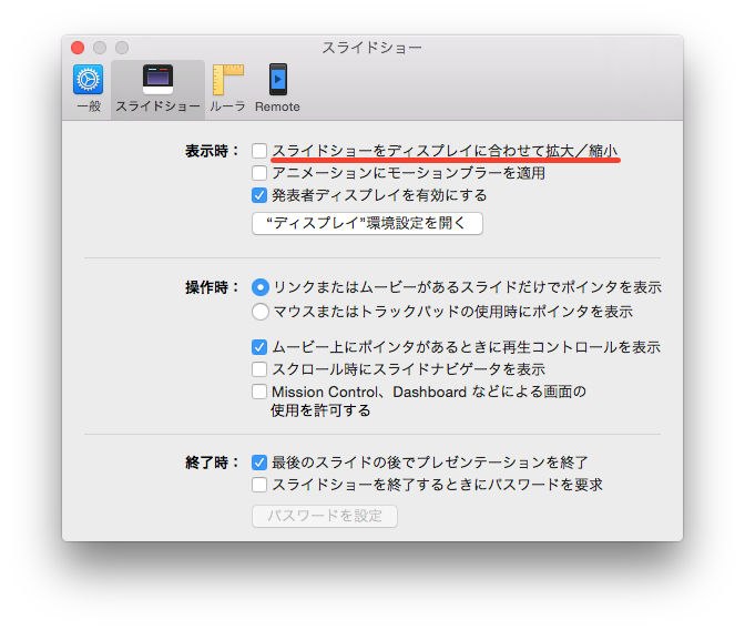 「環境設定」>「スライドショー」の「スライドショーをディスプレイに合わせて拡大/縮小」のチェックを外しておく