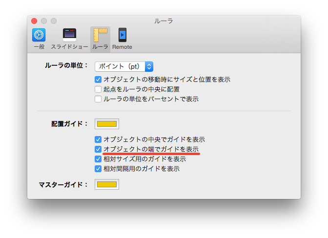 「環境設定」>「ルーラ」の「オブジェクトの端でガイドを表示」にチェックを入れておく